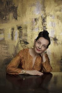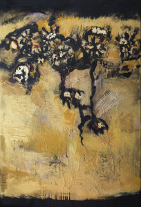 ”Maalaukseni ovat abstrakteja mutta niissä voi nähdä luonnon ja avaruuden draamaa. Lempimateriaaleistani kulta on peräisin miljardeja vuosia sitten maahan iskeytyneistä meteoriiteista, musta laava vuorostaan nousee maan tulisesta ytimestä. Metallivärit reagoivat herkästi valoon, joten maalauksista paljastuu erilaisia näkymiä eri vuorokaudenaikoina. Viimeistelen suuret maalaukset paljain käsin.”